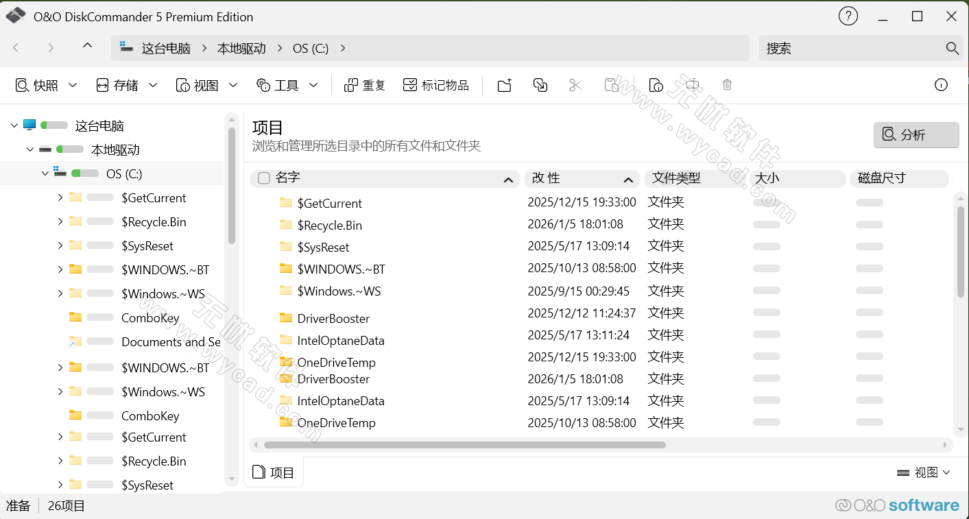 O&O DiskCommander 是 O&O Software 推出的 Windows 专业磁盘分析工具,主打磁盘深度检测与空间管理,最新版本新增备份镜像解析核心功能。软件兼顾专业人员与普通用户需求,可完成磁盘结构分析、重复文件查找、备份验证等多类操作,全程无破坏保障数据安全。